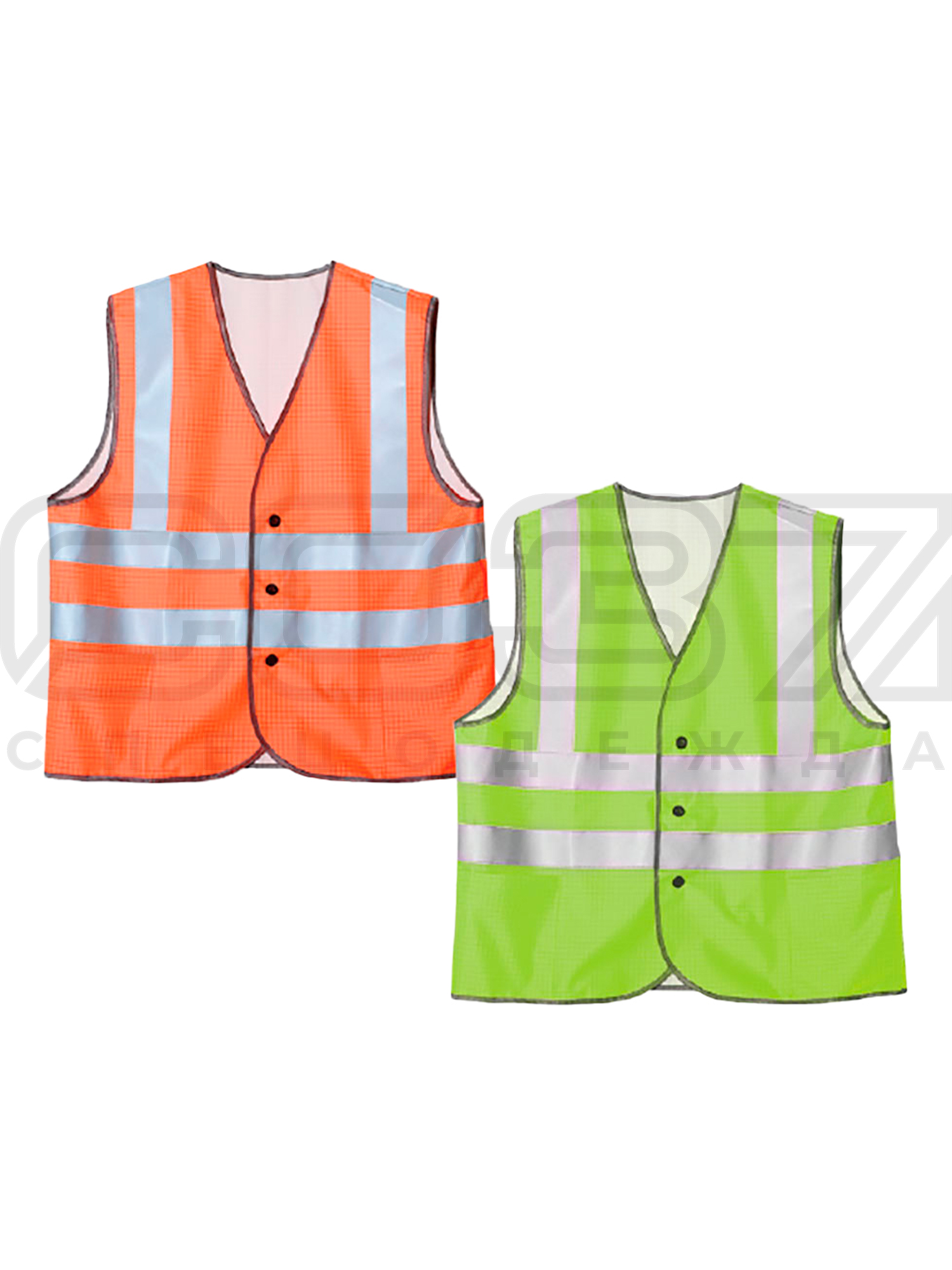 - На полочках и спинке настрочены в два ряда (на расстоянии не менее 50 мм друг от друга) горизонтальные и две вертикальных (от плечевых швов до горизонтальных полос) светоотражающие полосы (СОП) 2 класса.